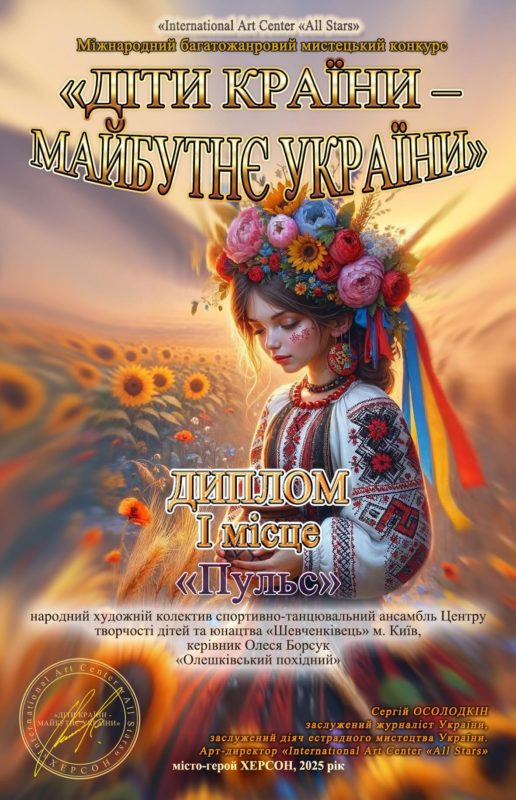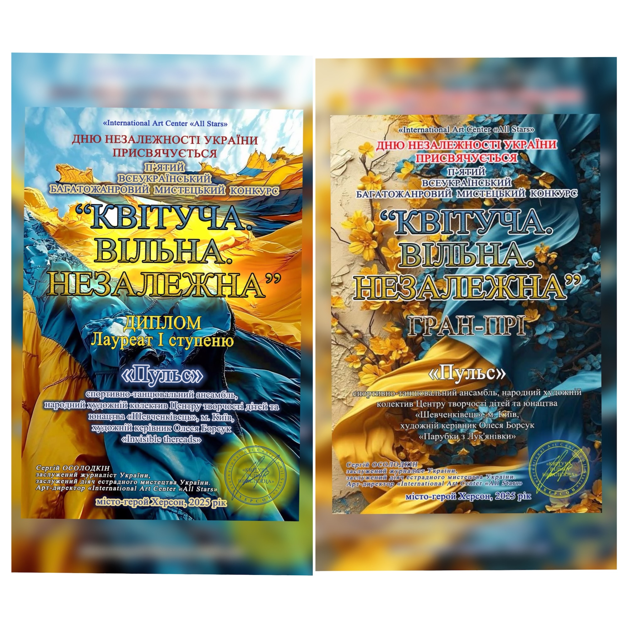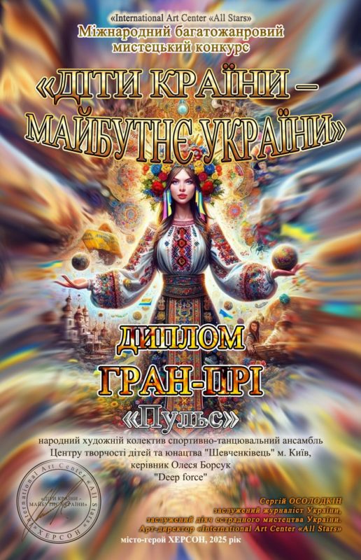 Ансамбль "Пульс" здобув найвищу нагороду мистецького конкурсу - Гран-прі! Дякую всім, хто вірить у нас , підтримує і надихає. 30 червня 2025 року було підведено підсумки Міжнародного багатожанрового мистецького конкурсу "Діти країни - майбутнє України". Відповідно до умов проведення конкурсу та на підставі рішення журі: Народний художній колектив “Спортивно-танцювальний ансамбль “Пульс” місто Київ, Центру творчості “Шевченківець”, нагороджено: ГРАН-ПРІ – хореографічна композиція «Deep force» (постановка Борсук О.В) Перша премія – хореографічна композиція «Олешківський похідний» (постановка Васяк В.А)